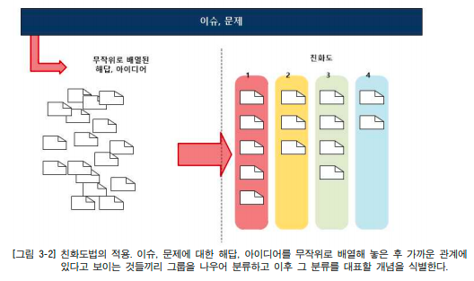 · 해결해야하는 문제 작성 → 관련한 정보를 포스트잇에 작성 → 관련성이 높은 것끼리 분류 → 유사성, 상관성을 고려하여 그룹화 → 그룹의 타이틀 작성 → 인사이트 정리
