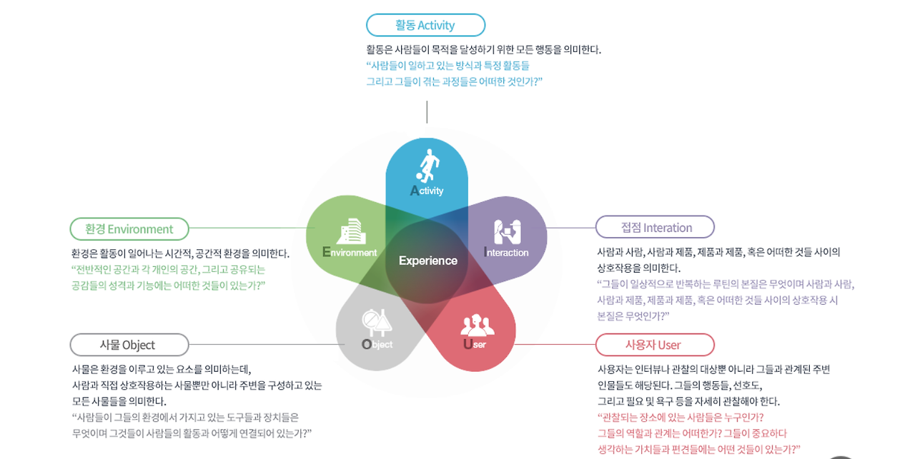 · 활동, 환경, 상호작용, 사물, 사용자의 5가지 주제가 적힌 시트를 준비하고, 대상을 관찰하며 발견된 내용을 작성.