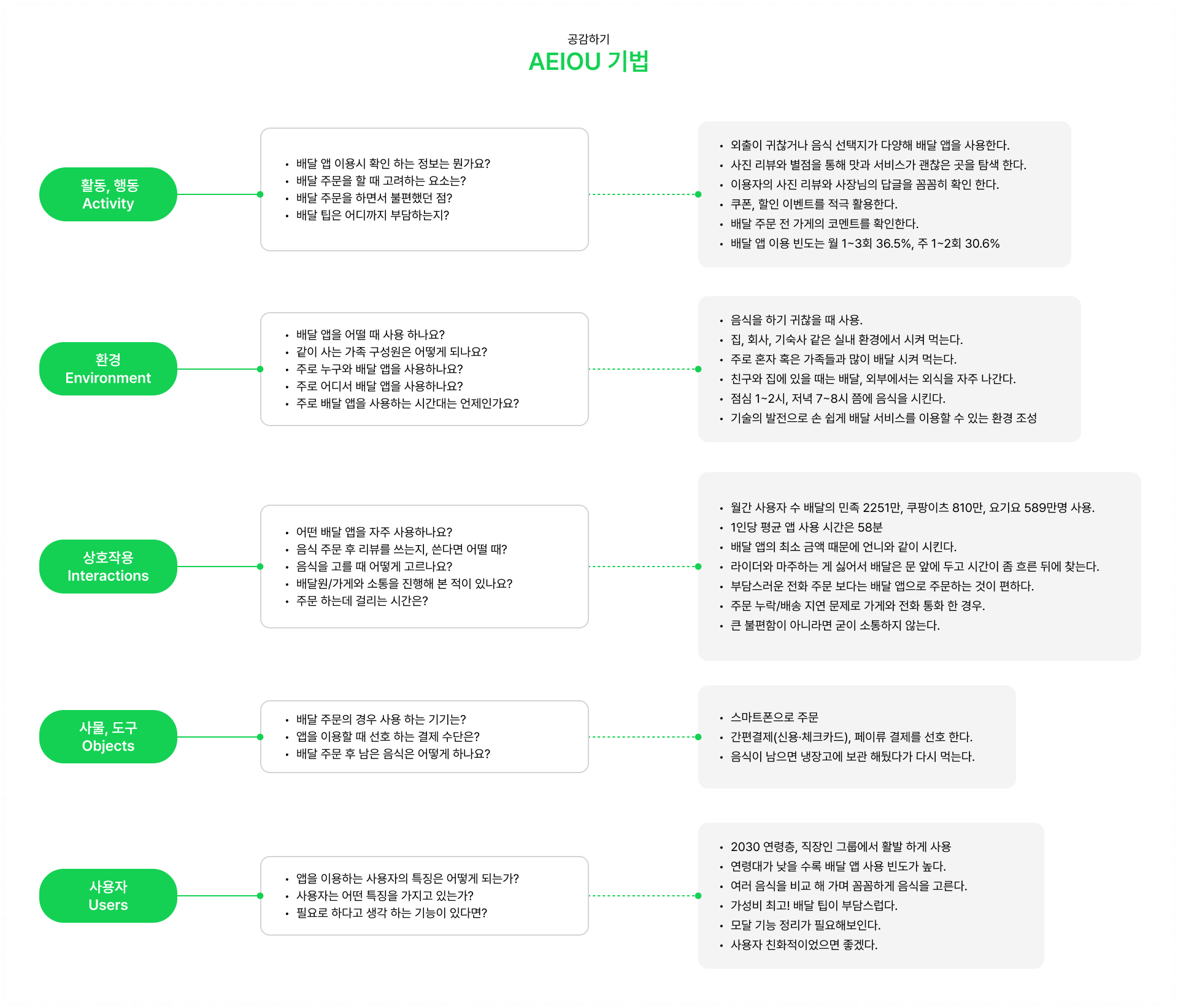 따라서, AEIOU 기법을 사용할 때 지인들에게 사용했던 질문지와 검색에 활용했던 내용들을 정리하여 1차로 적어두고, 그에 맞는 답변을 달아두는 형태로 다듬었다. 내용을 정리하면서 추가적인 인터뷰와 서치를 진행해 내용 부분도 보강했다.
