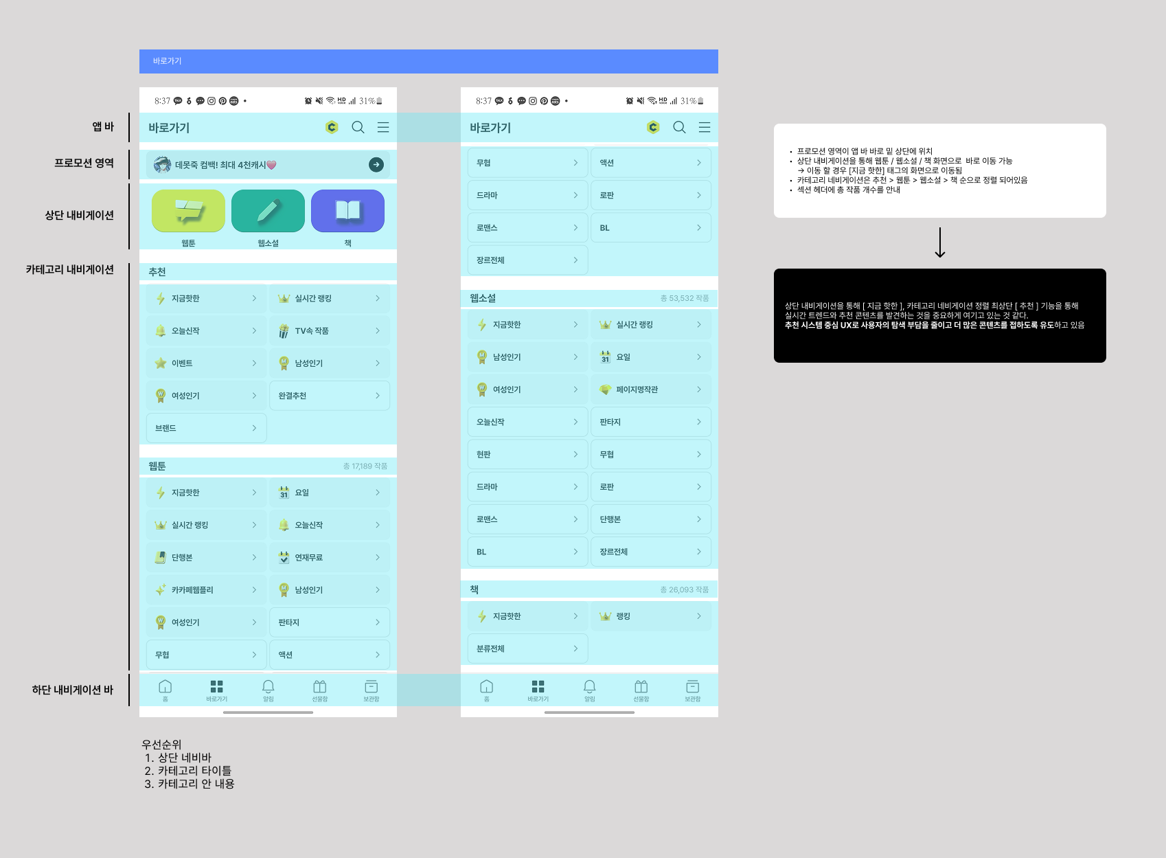 검색창, 보관함, 카테고리 화면을 맡아 화면은 어떤 구성으로 이루어져있는지, 앱 바와 같이 동일하게 만들어진 부분은 어디인지 등을 분석하고 정리했다.