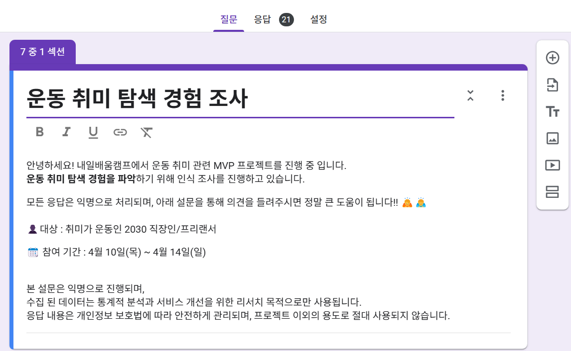 설문지 문항은 마구잡이로 정리해놔서, 인사이트를 도출하여 추가로 정리 중이다..!